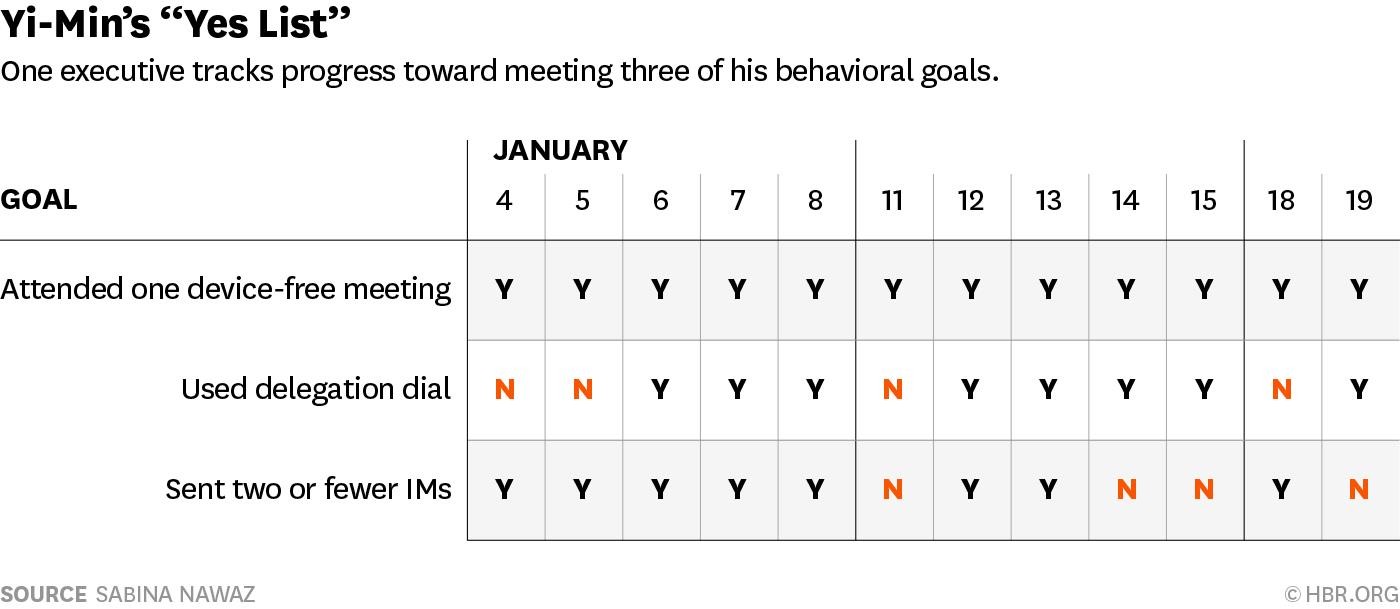 Reviewing his patterns also allowed Yi-Min to recognize when he was ready to introduce another habit aimed at achieving his goal. After practicing with one meeting a day, Yi-Min slowly increased the number of device-free meetings he attended until, four months later, he no longer used devices in meetings at all. He even stopped tracking his device-free meetings because it had successfully become habit. He now had the energy and focus to tackle a new habit. Yi-Min replaced the old one on the chart with the next one in his goal of being a better listener: paraphrasing what he heard at least once a day. He continued the pattern of creating a habit and adding a new one for each of his three goals. A year later, Yi-Min’s staff consider him to be a stronger listener, a mindful collaborator, and an empowering manager.