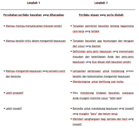 Beruntung, sistem perilaku yang tidak mengembangkan itu bisa diubah. Hanya dua langkah yang perlu dilakukan untuk mengubah pola tersebut. Pertama, menemukan perubahan yang Atasan harapkan terjadi pada bawahan. Kedua, menemukan perilaku apa yang perlu Atasan ubah untuk mendorong perilaku bawahan. Kedua langkah tersebut bisa dirumuskan seperti berikut ini.