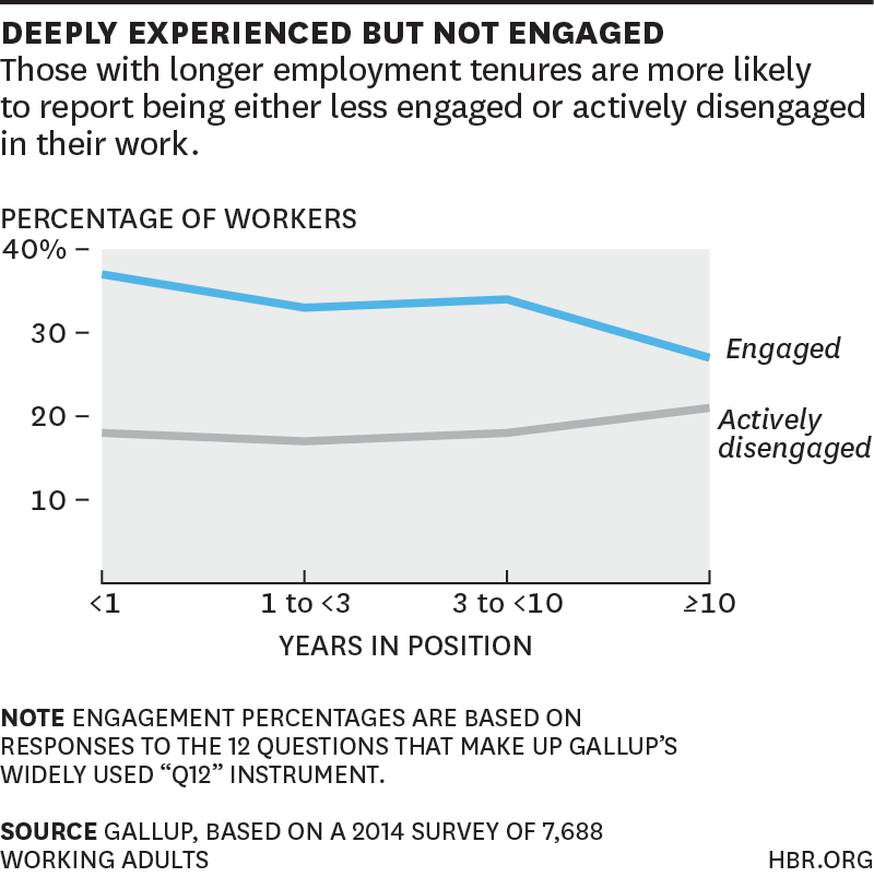 Belum lagi jika lebih detil melihat karyawan sesuai masa kerjanya. Dikutip dari artikel James Harter di Harvard Business Review bertajuk Engage Your Long-Time Employees to Improve Performance, Harter menuliskan kenyataan pahit yang kita sama-sama tahu, bahwa “Somewhere along the way, most workers lose some of their motivation to make a difference and create value for their employers.” Ya, seiring berjalannya waktu, kebanyakan karyawan kehilangan motivasinya untuk menjadi lebih berarti bagi perusahaan. Dan ini adalah masalah bagi para pemimpin. Mendayagunakan kembali karyawan lama bisa jadi cukup menantang, tetapi meminimalisir turnover mereka tentu lebih praktis ketimbang mencari tenaga baru (yang meskipun sudah dikembangkan dengan biaya mahal belum tentu bisa cocok ditempatkan di posisinya).
