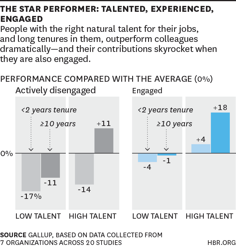 Yang terbaik adalah jika masa bakti berbanding terbalik dengan komitmen, mengarah ke peluang yang belum tersentuh oleh kebanyakan organisasi: peningkatan performa yang diperoleh dengan membenahi komitmen karyawan lama. Data Gallup memang menunjukkan sebaliknya, tetapi dapat disimpulkan bahwa mereka yang berperforma paling baik dalam perusahaan seharusnya karena memiliki tiga hal dalam diri mereka: (1) mereka memiliki masa bakti sepuluh tahun atau lebih di perusahaan; (2) mereka bekerja dengan komitmen; (3) mereka menempati posisi yang amat pas dengan bakat alaminya. Masing-masing variabel mempengaruhi outcome dengan caranya sendiri, tetapi performa terbaik datang dari kombinasinya.
