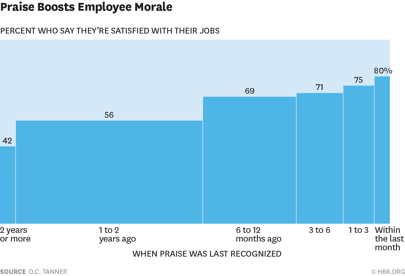 Sebuah studi tahun 2015, yang melibatkan 980 responden dari perusahaan-perusahaan yang memiliki lebih dari 1000 karyawan, juga menyarankan suatu hubungan yang istimewa antara pengakuan dan kepuasan kerja. 7 dari 10 karyawan yang melaporkan bahwa mereka menerima beberapa bentuk apresiasi dari para supervisor mereka mengatakan bahwa mereka senang dengan pekerjaan mereka. Di sini, frekuensi juga memainkan peran besar. Diantara para karyawan yang dipanggil atas kerja bagus mereka di bulan sebelumnya, 80% merasa puas dalam pekerjaan mereka. Jumlah tersebut menurun tajam berdasarkan waktu: 75% puas (diakui untuk kinerja bagus 1-3 bulan sebelumnya); 71% (3-6 bulan); 69% (6-12 bulan); 56% (1-2 tahun); 42% (2 tahun atau lebih).