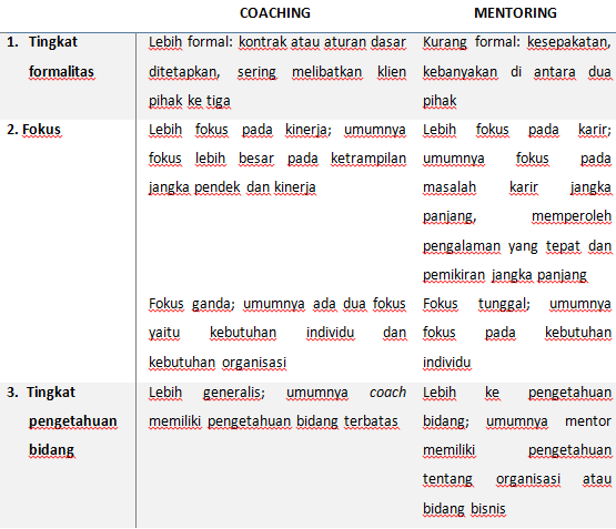 Dikutip dari Excellence in Coaching (Passmore, 2010), perbedaan Coaching dan Mentoring disajikan dalam tabel di bawah ini.